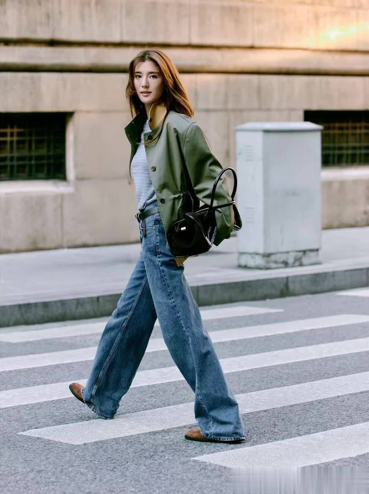 还有她穿牛仔外套的样子,选的是那种有点做旧的浅蓝色,袖口故意卷到小臂,露出手腕上叠戴的细手链。里面搭件白色吊带,下身配条高腰直筒牛仔裤,裤脚卷两圈露出脚踝,踩双帆布鞋,随性得像刚从大学校园走出来的学姐。关键是她把牛仔外套的领口往下拉了点,露出精致的锁骨,一下子就把休闲感和小性感平衡得刚刚好,普通女孩学这个细节,立马摆脱路人感!