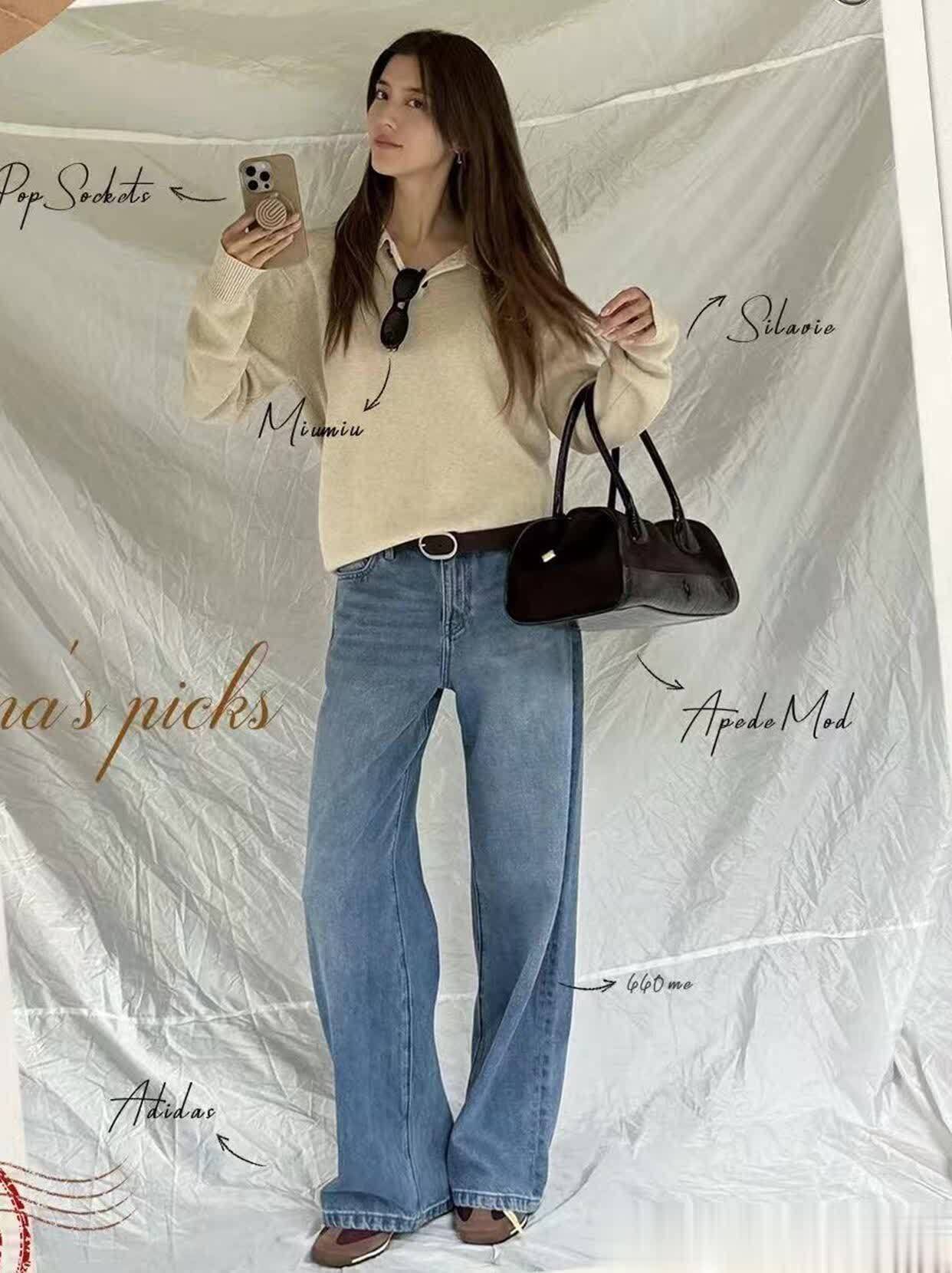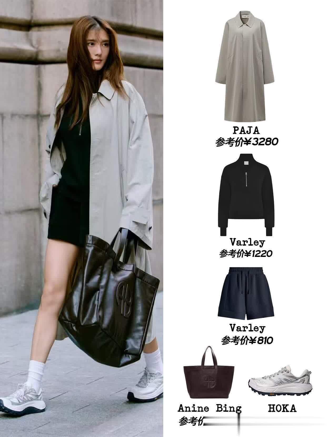 最戳我的是她的配色思路,永远不超过三个颜色,而且擅长用同色系深浅搭出层次感。比如一身奶白色套装,内搭选稍深一点的米白打底,鞋子再用浅棕色点缀,温柔得像块棉花糖;或者用黑色小吊带配深灰色阔腿裤,外搭件浅灰色针织开衫,冷的时候把开衫扣两颗扣子,热了就敞开,慵懒又自在。